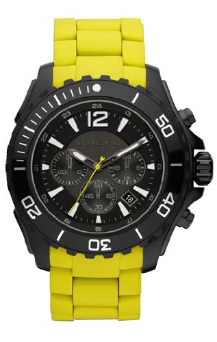 Stainless steel case with a yellow silicone (wrapped stainless steel) strap. Black ion-plated bezel. Black dial with black hands and index hour markers. Arabic numeral marks the 12 o'clock position. Minute markers. 24 hour markers around the outer rim. Dial Type: Analog. Luminescent hands and markerMK: Watch Do not Miss!! Stainless steel case with a yellow silicone (wrapped stainless steel) strap. Black ion-plated bezel. Black dial with black hands and index hour markers. Arabic numeral marks the 12 o'clock position. Minute markers. 24 hour markers around the outer rim. Dial Type: Analog. Luminescent hands and marker... MK: Watch