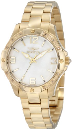 Invicta Lady Elegant White MOP Bracelet - IS535 - All gold tone Quartz movement Flame-fusion crystal; 18k gold ion-plated stainless steel case and bracelet Two tone second hand White mother-of-pearl dial with silver and gold tone hands, hour markers and arabic numerals; luminous; white crystals set Invicta Women's 11722 Wildflower Mother-Of-Pearl Dial 18k Gold Ion-Plated Stainless Steel Watch Do not Miss!! Invicta Lady Elegant White MOP Bracelet - IS535 - All gold tone Quartz movement Flame-fusion crystal; 18k gold ion-plated stainless steel case and bracelet Two tone second hand White mother-of-pearl dial with silver and gold tone hands, hour markers and arabic numerals; luminous; white crystals set ... Invicta Women's 11722 Wildflower Mother-Of-Pearl Dial 18k Gold Ion-Plated Stainless Steel Watch